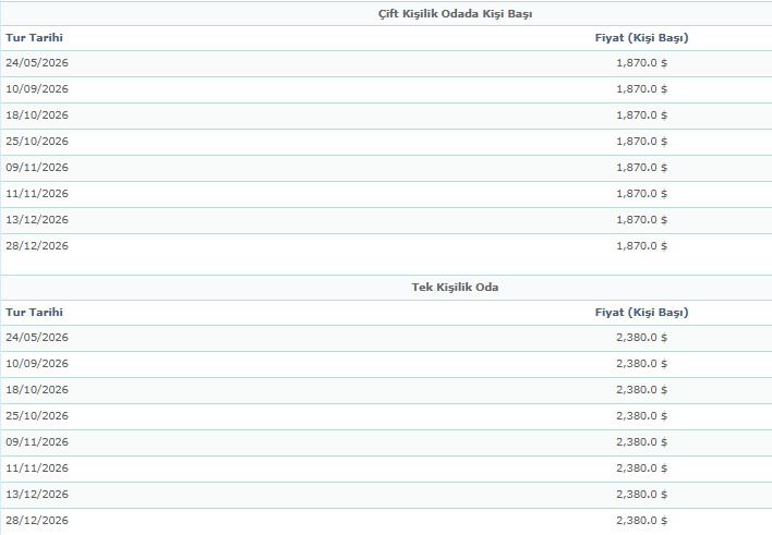 • Fiyatlara tüm uçuş, konaklama, transfer ve turlar dahildir (Hizmetler kategorisinde belirtilen "Ücrete Dahil Olan Hizmetler" listesine göre).
