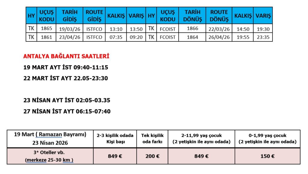 - Tur – Alan – Tur Lideri- Otel bilgilendirmeleri tur hareketinden 48 saat önce satış danışmanınız tarafından e-posta ve sözlü olarak yapılacaktır.